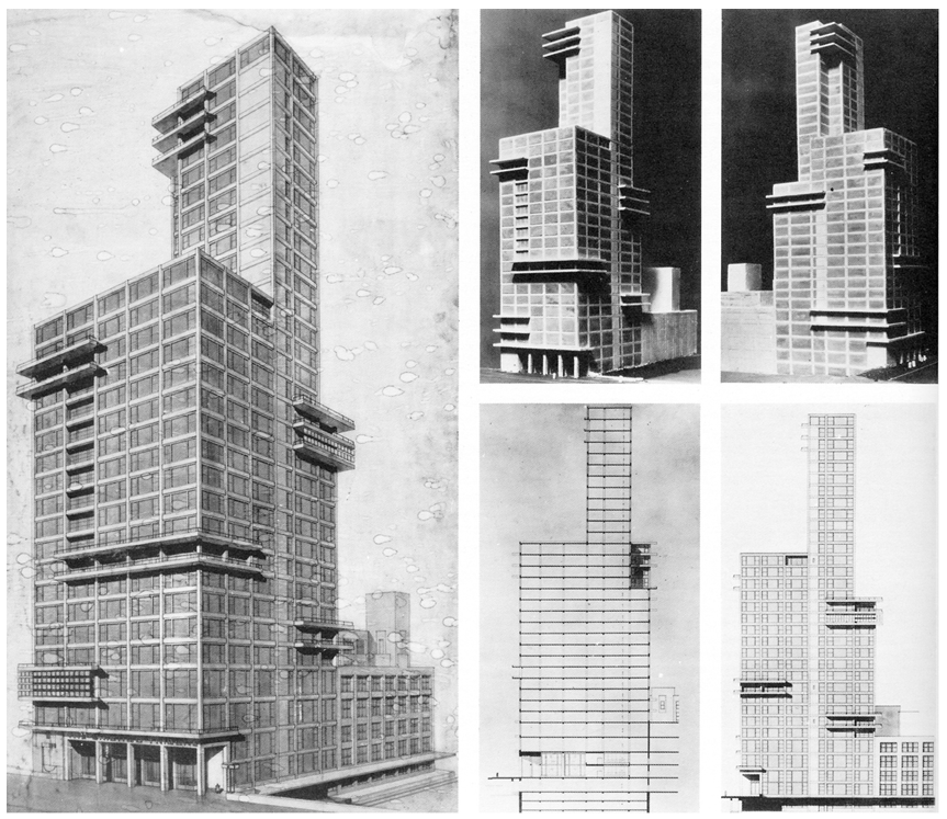 Cuando confrontamos el proyecto de Gropius de 1922, con el almacén de Carson,Pirie y Scott, de Sullivan, se nos aparecen como dos etapas en la evolución de las mismas ideas. En ambos la malla de la estructura es la base de la expresión arquitectónica, de la cual es inseparable. Hay las mismas líneas exteriores perfectamente trazadas y ligeras. Gropius utiliza aquí también la “ventana de Chicago”, con un panel de cristal fijo en el centro, y estrechas ventanas para la ventilación de los lados. El proyecto, en su conjunto, parece ser una producción de la Escuela de Chicago, pero en realidad la ventana de ese nombre y los rascacielos de aquella ciudad americana eran desconocidos en Europa (Giedion, 1941).