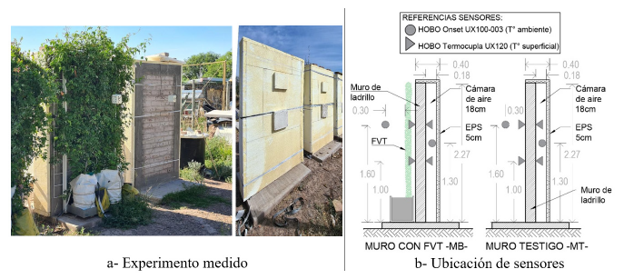 Para determinar el conjunto de propiedades ópticas y térmicas que representan el comportamiento de una FVT, a fin de insertar la tecnología en el software de simulación, se midió y ajustó un ensayo experimental en condiciones controladas durante el verano 2022. El mismo se ubica en el área experimental del CCT CONICET Mendoza-Argentina. Ver Fig. 2. Comprende dos muros de mampostería orientados al Oeste (orientación más desfavorable en verano), aislado en el resto de sus caras para conformar una cámara de aire interior. El primer muro está cubierto con una FVT -Pandorea jazminoides “bignonia blanca”- (MB) que reportó mejor comportamiento entre las especies trepadoras evaluadas (Suárez, Cantón & Correa, 2024). El otro muro se encuentra sin cobertura vegetal y se denomina muro testigo (MT). La especie trepadora fue seleccionada en función de su adaptación al clima local, el desarrollo de una cobertura foliar próxima al 90% y un valor de espesor vegetal promedio de 0,27 m (Suárez, Cantón, & Correa, 2023).