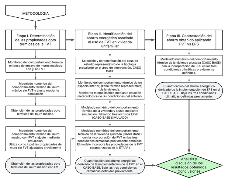 El estudio se estructura en tres instancias metodológicas. Ver Fig. 1. La primera busca establecer el conjunto de propiedades ópticas y térmicas que representan el comportamiento de una FVT a fin de insertar este modelo en el software de simulación EnergyPlusTM. Para ello se lleva a cabo una medición, simulación y ajuste de un ensayo experimental en condiciones controladas. Esto posibilita integrar la FVT a los modelos de simulación dinámica de comportamiento térmico de edificios con el fin de valorar los aportes termo-energéticos del uso de la tecnología.