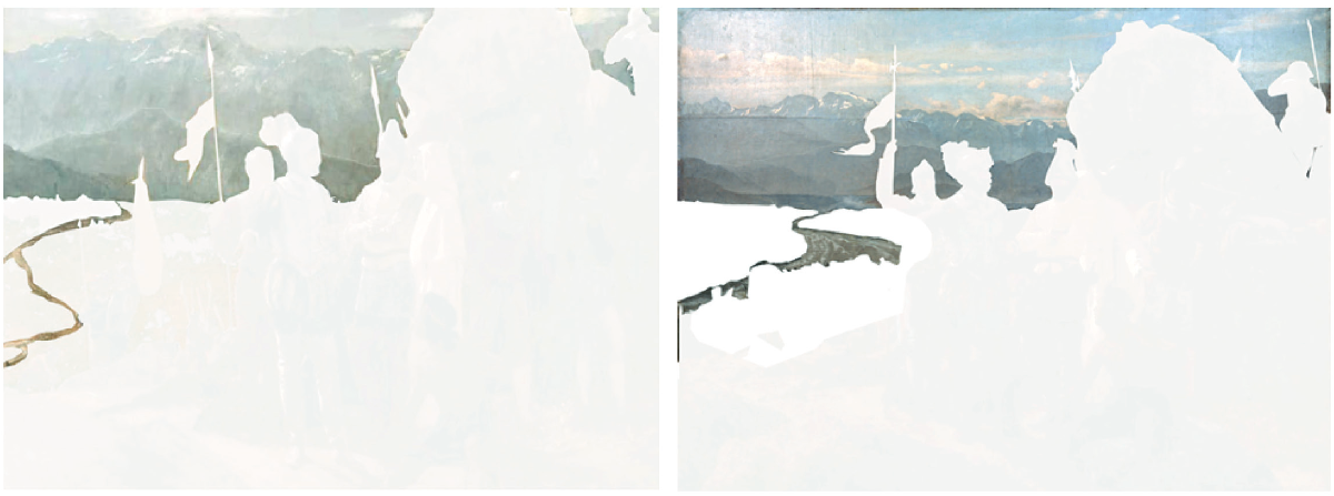 Figura 9. Visualización completa sin personajes de ambas versiones de "La Fundación de Santiago". Elaboración propia (2020) basada en las obras originales: versión de estudio (1885-1888), Colección Banco Santander, y versión final (1888), Colección MNBA.