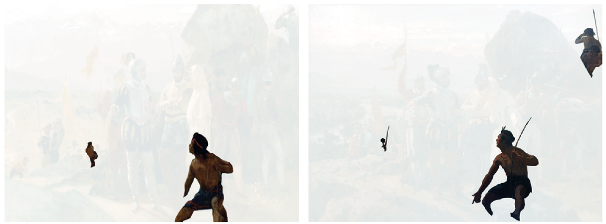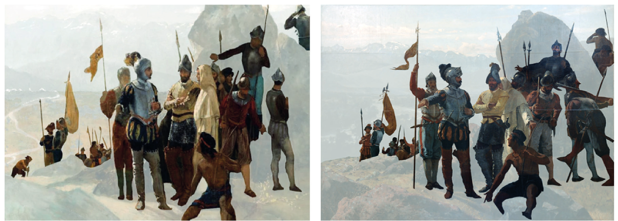 Además, el uso del color es otro elemento digno de análisis. En la primera versión, los tonos más oscuros utilizados para los personajes indígenas no solo los diferencian de los españoles, sino también del paisaje. En la segunda versión, los aborígenes son pintados con una paleta cromática que se asemeja más a los tonos del suelo, estableciendo una conexión simbólica entre ellos y la naturaleza. Esta representación contrasta marcadamente con la perspectiva española, que busca reforzar el dominio sobre el paisaje y los pueblos originarios. Este cambio podría interpretarse como una forma de representar la cosmovisión indígena, donde el vínculo entre los pueblos originarios y su entorno natural es esencial y profundo, articulando un discurso visual que refuerza la narrativa de la dominación colonial sobre los pueblos y el paisaje del territorio por cuanto “el paisaje constituye uno de los rasgos de identidad de los pueblos, pues no en vano cualquier recuerdo, cualquier evocación de un país, de una región, de una comarca o de un pueblo va asociada a un paisaje concreto”. (Naranjo, 2006)