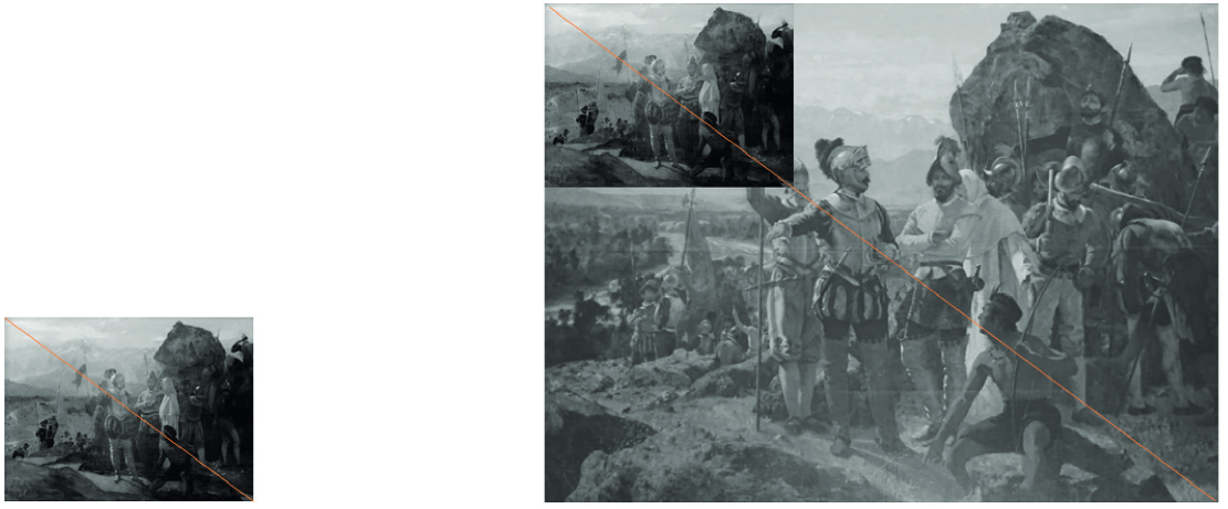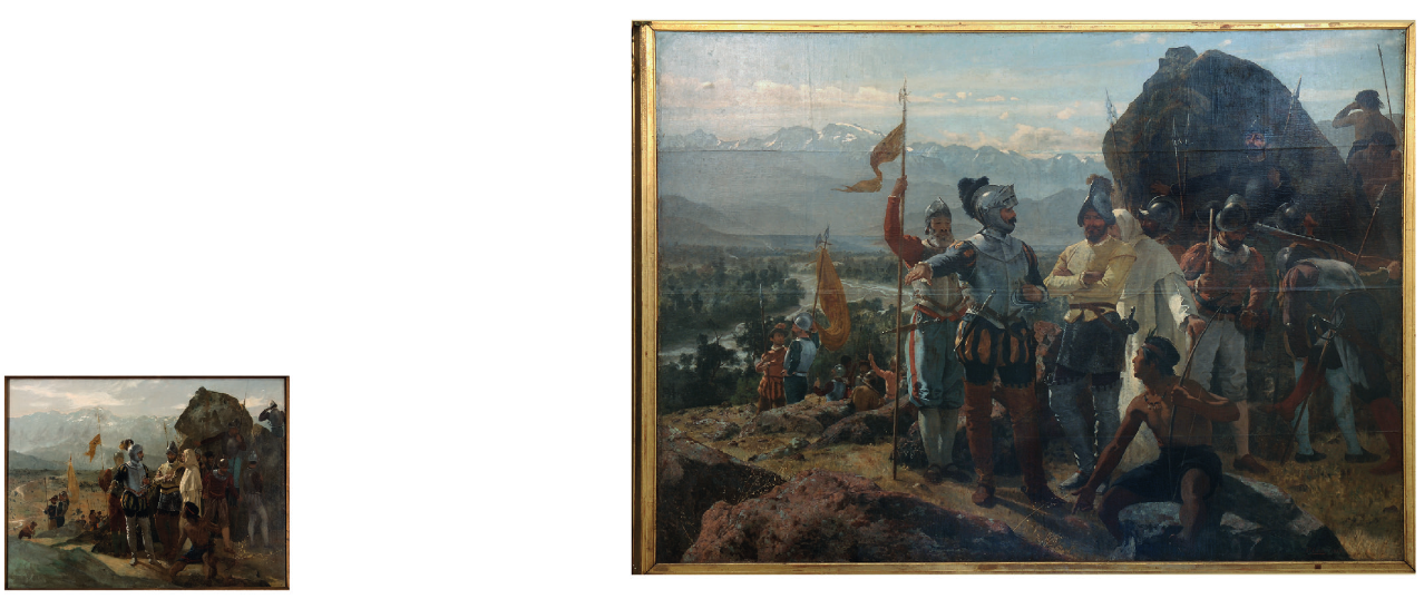 Figura 2. Comparación dimensional de las versiones de "La Fundación de Santiago" de Pedro Lira. A la izquierda: versión de estudio (1885-1888), Colección Banco Santander, Santiago, fotografía de Fernando Maldonado. A la derecha: versión final (1888), 4,0 x 2,5 m, Colección MNBA.