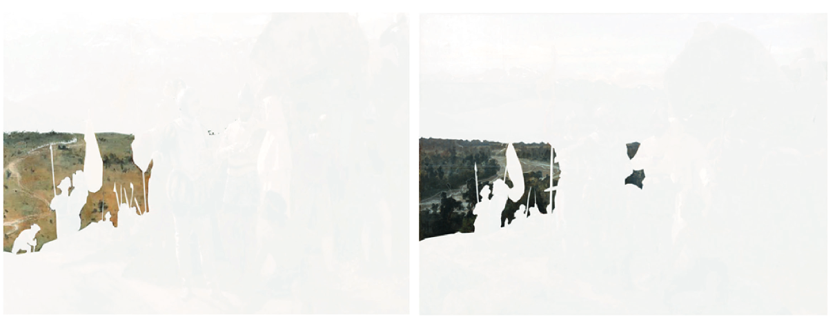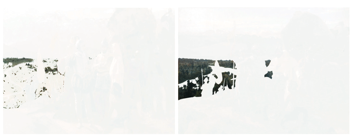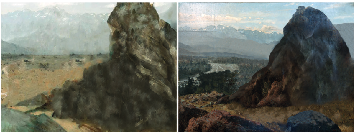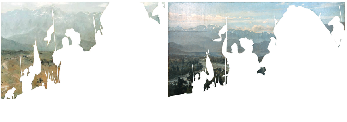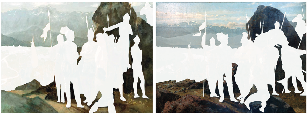 Figura 4. Reconstrucción digital del paisaje de fondo en ambas versiones de "La Fundación de Santiago", sin personajes. Elaboración propia (2020) basada en las obras originales: versión de estudio (1885-1888), Colección Banco Santander, y versión final (1888), Colección MNBA.