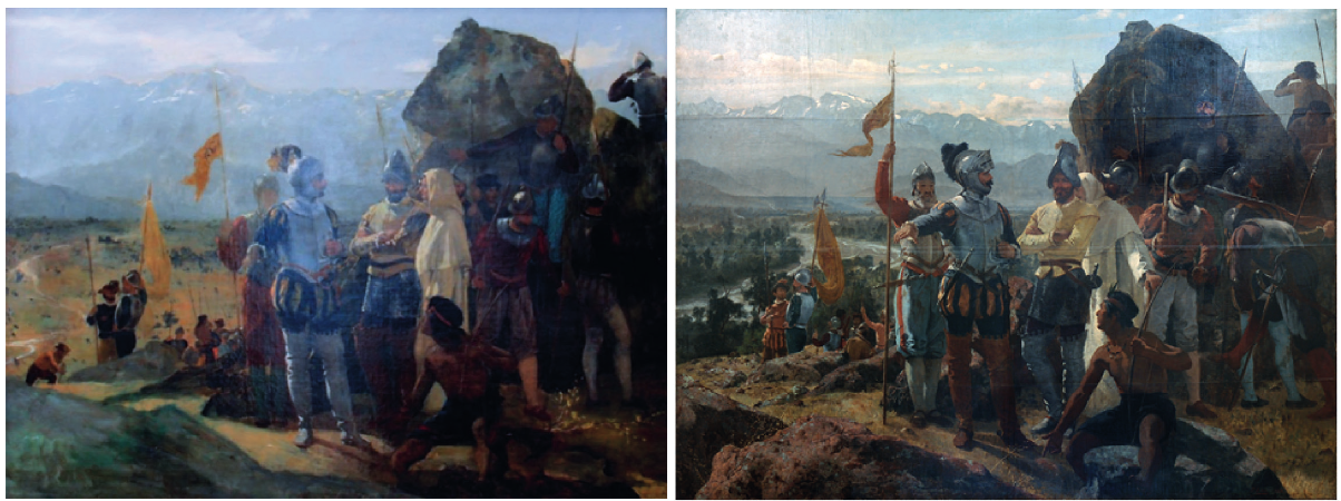 Figura 3. Visualización sin marco de las versiones de "La Fundación de Santiago". A la izquierda: versión de estudio (1885-1888), Colección Banco Santander, Santiago, fotografía de Fernando Maldonado. A la derecha: versión final (1888), Colección MNBA.