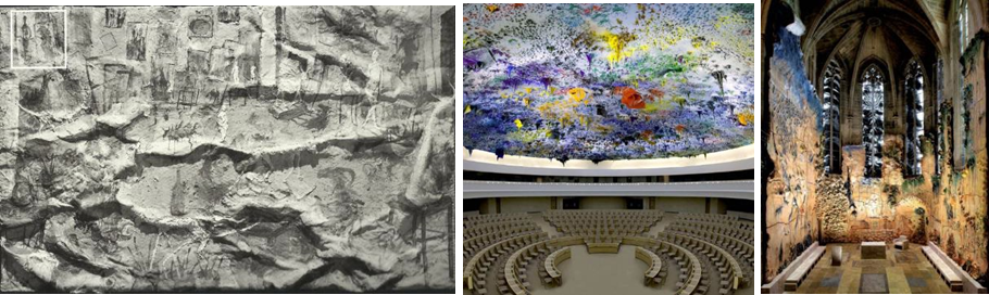 Figuras 22 - 24. Obras de Miquel Barceló. De izquierda a derecha: Obra 1: El taller de esculturas (Barquelo, 1993) (235 x 373 cm.). Museo Nacional Centro de Arte reina Sofía Fuente: Barquelo (2002), Obra 2: Cúpula de la XX Sala derechos humanos, ONU, Ginebra Fuente: Priego, 2018. En: Obra 3: Milagro de la multiplicación de los panes y peces. Obra cerámica policromada en pared capilla lateral de catedral de Sevilla. España