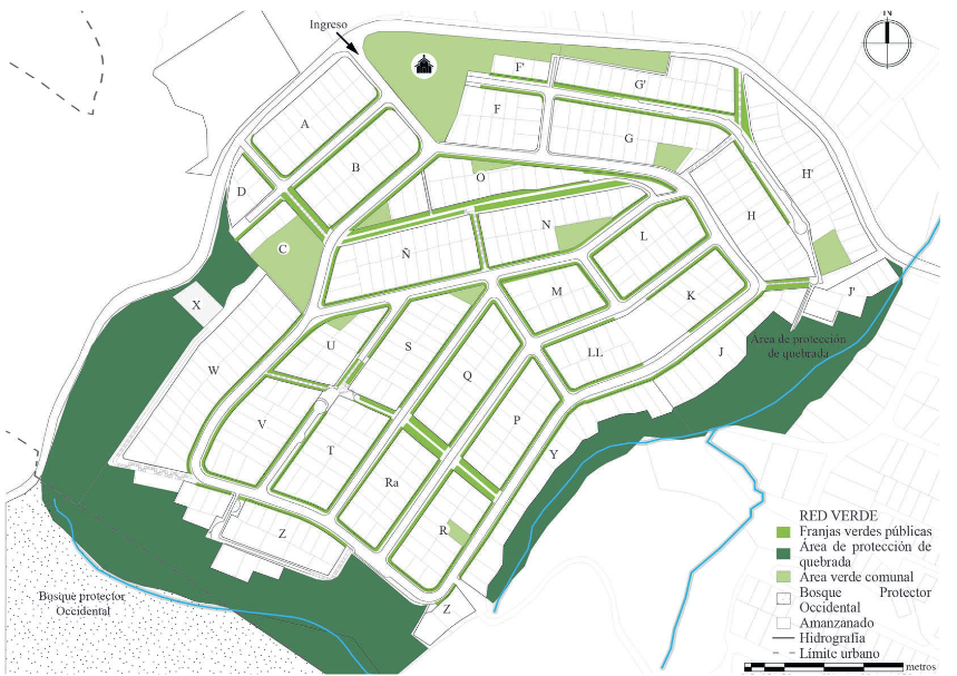 El barrio Víctor Emilio Valdivieso (figura 2), se encuentra junto a áreas de protección de remanentes de hábitats protegidos por el Estado como el bosque protector de la cordillera occidental (Ministerio de Ambiente del Ecuador, 2012). El barrio nace en 1995, la familia de VEV donó un terreno de 15,87 ha. a la Curia de Loja y el acuerdo fue servir a los más pobres. En 1996, tras realizarse la lotización y la apertura vial, se efectúa el sorteo de los predios. Los beneficiarios eran pobladores en extrema pobreza, muchos llegaron a vivir armando con palos y plásticos su vivienda. En estas circunstancias los promotores del proyecto obviaron el análisis técnico de las características del terreno, dándole más énfasis a su intención solidaria que a las condiciones topográficas. Pese a las dificultades de la planificación del proyecto y a la permisividad municipal, cabe recalcar que se diseñaron franjas verdes públicas, algo no común en las urbanizaciones de la ciudad. Entre las consecuencias de obviar los parámetros de la planificación urbana resaltan las dinámicas socio espaciales negativas, y que hoy se traducen en inseguridad en ciertos espacios del barrio afectando la calidad de vida de todos sus habitantes.