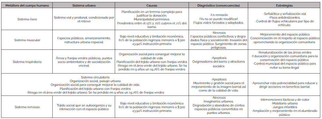 De los resultados expuestos se resalta en el siguiente resumen (Tabla 3) el análisis cualitativo aplicando la metáfora en los sistemas seleccionados, sus causas, consecuencias y estrategias. Muestra que el «sistema respiratorio y circulatorio del barrio», es decir la organización y liderazgo social funcionan saludablemente, en los dos casos debido a la presencia de espacios verdes en el tejido urbano, lo cual ha permitido la mejora en el paisaje urbano y detener la degradación moral del barrio.