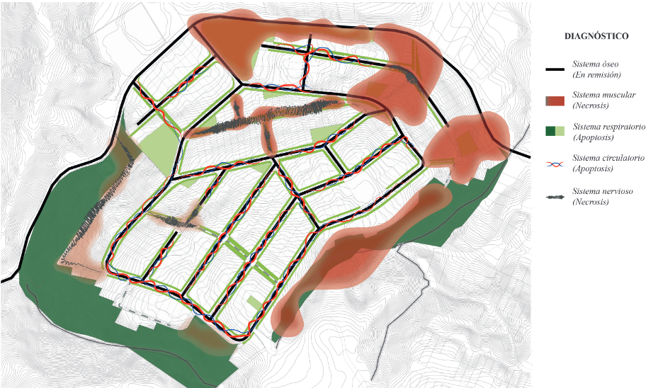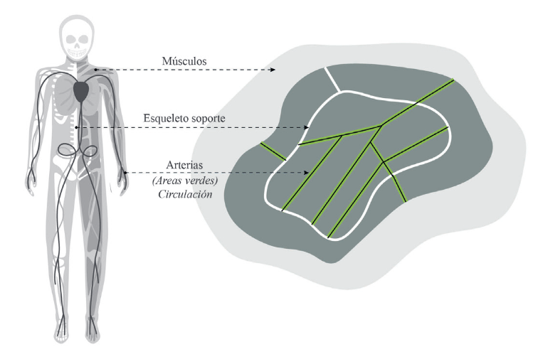 A través de la metáfora se interpretan los resultados relacionando los sistemas urbanos con los sistemas del cuerpo humano (Figura 4) se precisaron tres sistemas vitales: el sistema vial como una analogía del esqueleto que estructura y soporta unido al sistema muscular como su relieve; el sistema circulatorio y el respiratorio fueron pensados como el espacio público y las franjas verdes debido a que permiten la purificación del espacio. El sistema social con el sistema nervioso que crea relaciones y conexiones vivas que actúan ante diferentes estímulos o situaciones.