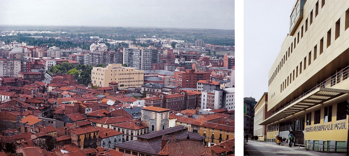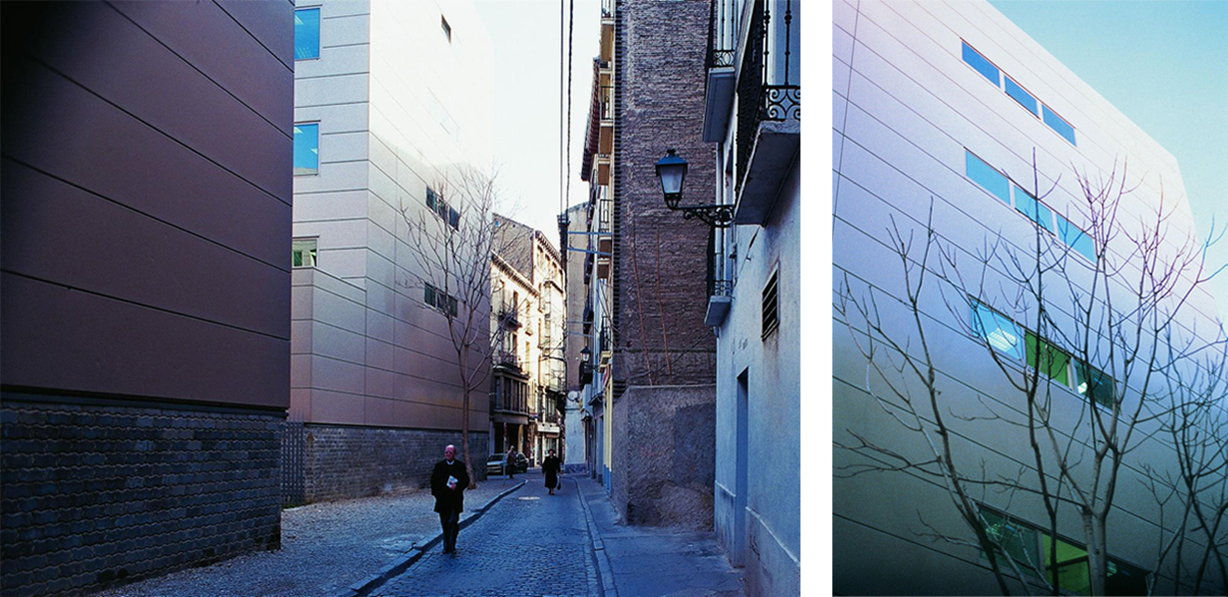 Nos acercamos al final de la vida del arquitecto y observamos la reiterada utilización del sistema de paneles ligeros de Robertson en edificios de escalas y usos muy diferentes, como en el proyecto no construido para el Museo Arqueológico Provincial de León (1984), concebido a partir de la rehabilitación del antiguo Palacio Episcopal (Figura 15), o el Edificio de Juzgados de Zaragoza (1985-89) (Figura 16). Al igual que en el resto de sus obras con Robertson, en ambos proyectos el arquitecto tiende a realizar un uso más natural y práctico del panel. Los proyectos parten del empleo del sistema y ahondan en su potencial técnico y arquitectónico, buscando el completo ajuste entre los requerimientos funcionales y constructivos, adaptados al espacio específico que el proyecto debe completar, para convertirlo, así, en un lugar habitable. La lógica de la técnica constructiva aleja a la arquitectura de los criterios de composición clásicos, mientras que la calidad y el confort de los nuevos materiales sustituye a la representatividad social asociada a los sistemas tradicionales. Todo ello en total sintonía con el propósito de que la construcción, entendida como una actividad esencialmente humana orientada a posibilitar el habitar, maximice su contribución aliviando el esfuerzo innecesario propio de una mal entendida concepción de la cultura.