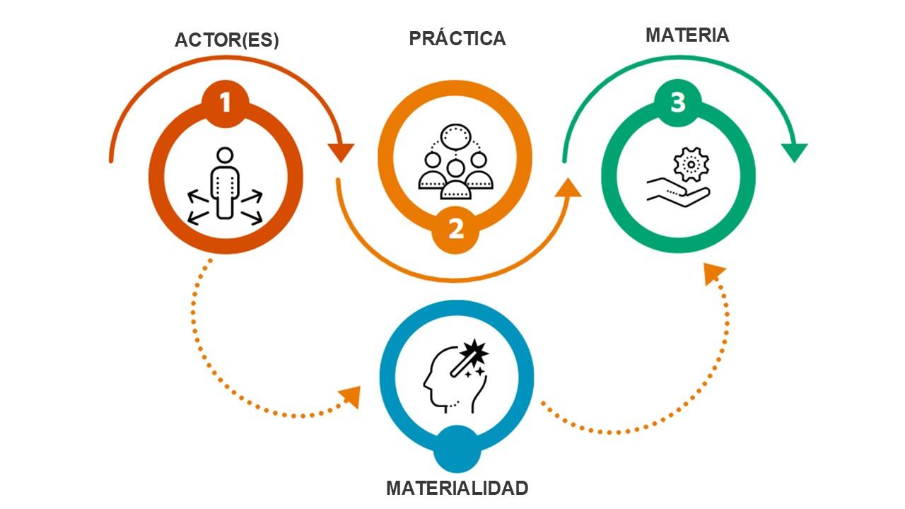 En conjunto, actor, práctica y materia se articulan mediante la materialidad como un sistema en continuo movimiento (fig. 1). Se entiende como una estructura de comunicaciones transversales, intercambiables, múltiples y que se unen por medio de la materialidad, “se trata del modelo que no cesa de constituirse y destruirse, y del proceso que no cesa de extenderse, interrumpirse y recomenzar” (Deleuze y Guattari, 2016, p. 58).