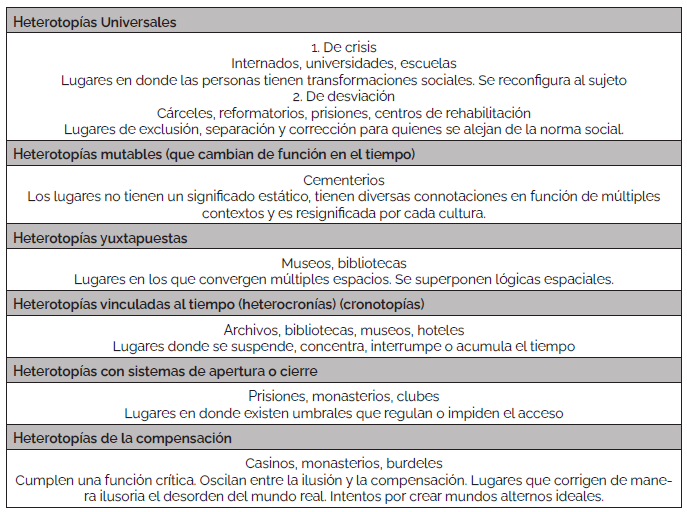 Foucault (1984, p.4-8) identifica seis tipos de heterotopías, aunque nos invita a pensar que ello no implica que se cuenta con una lista acabada, exhaustiva ni cerrada. El pensador las desglosa en heterotopías: universales, mutables, yuxtapuestas, heterocronías, con sistemas de apertura o cierre y las de compensación (tabla 1).