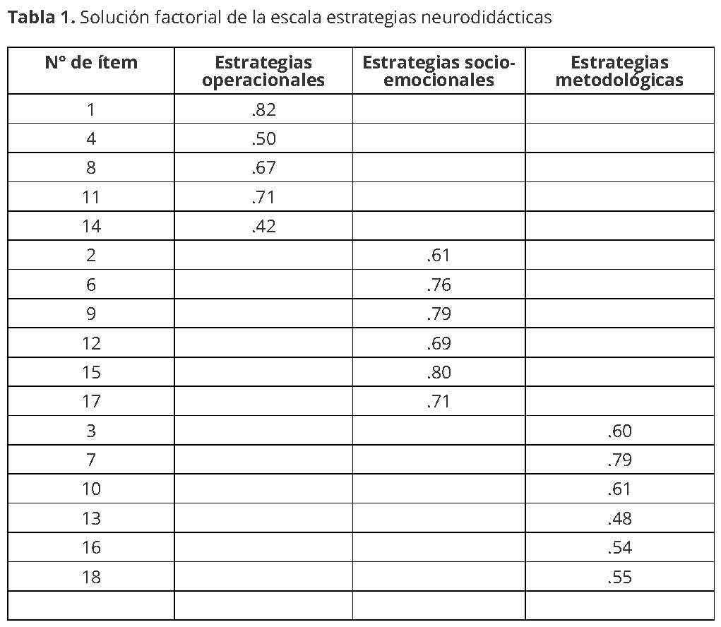 Tabla 1:Solución factorial de la escala estrategias neurodidácticas
