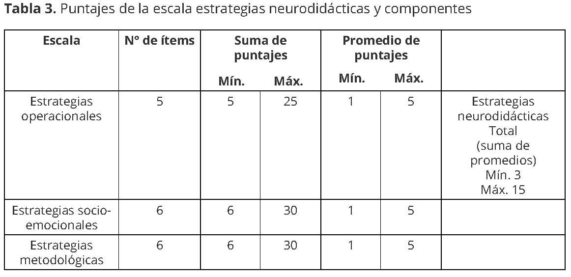 Tabla 3:Puntajes de la escala estrategias neurodiácticas y componentes