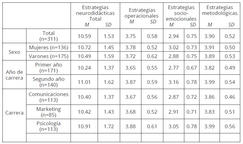 Las estudiantes, los estudiantes de segundo año y los que pertenecen a la carrera de Psicología han reportado mayor uso de estrategias neurodidácticas por parte de los docentes. Asimismo se ha observado que estos grupos presentan un mayor índice de satisfacción académica. Estos resultados sirven como insumo para reflexionar sobre el servicio educativo que se brinda: todos los estudiantes, y no solo unos grupos, deben ser partícipes de actividades educativas que promuevan integralmente el aprendizaje y que cumplan con sus expectativas, es decir, a lo largo de la formación universitaria deben percibir que todos los docentes emplean estrategias neurodidácticas dirigidas a mejorar el aprendizaje.