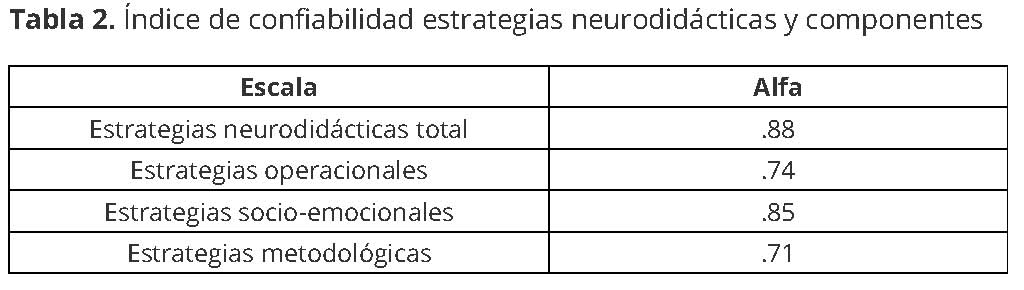 Debido a estas modificaciones en el instrumento de estrategias neurodidácticas evaluó una vez más la consistencia interna de la escala y sus dimensiones en la muestra final. Se obtuvieron índices superiores a .70 lo cual indica que la escala empleada en la investigación es confiable (ver Tabla 2).