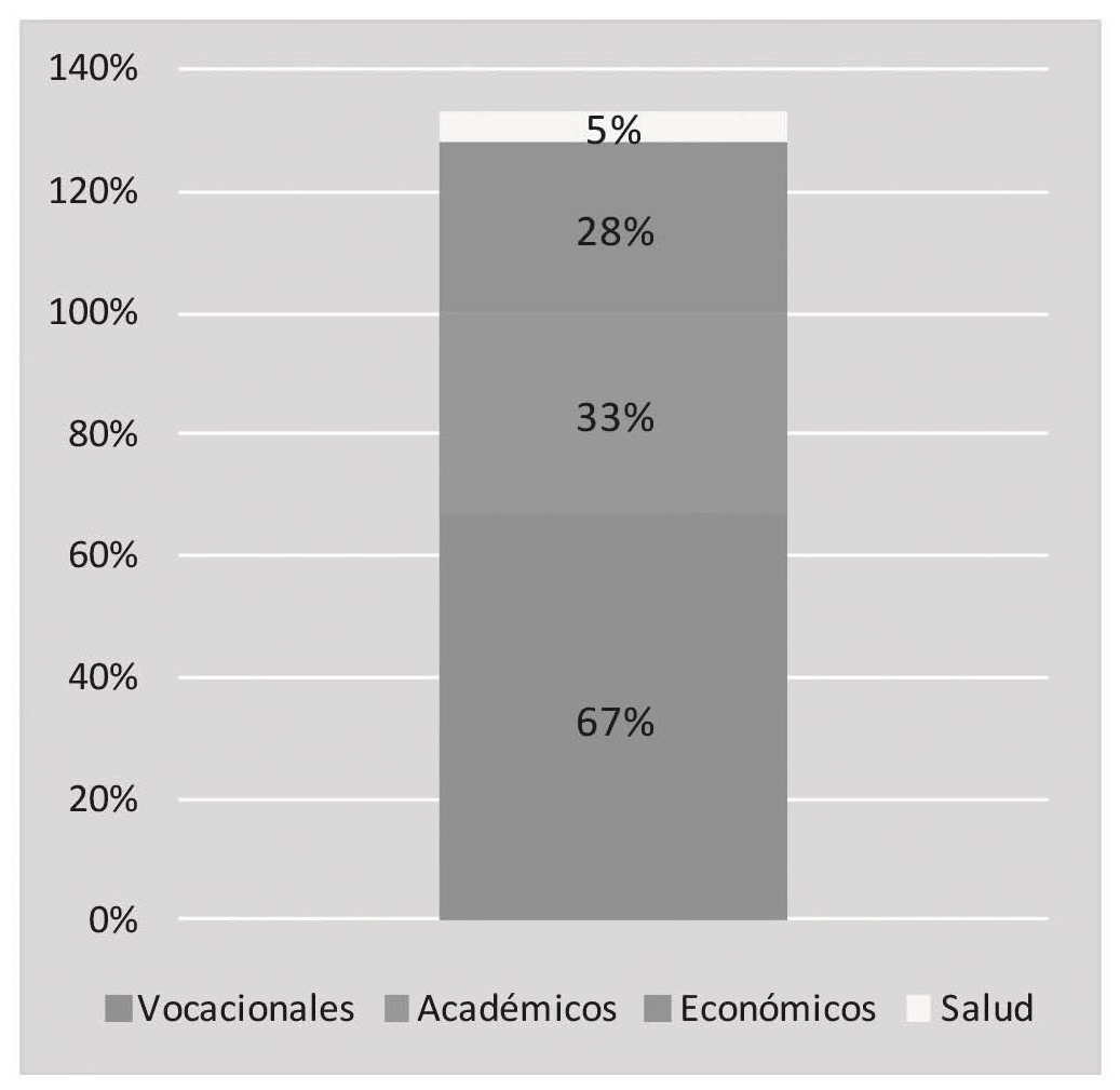 Motivos de salud. Finalmente, un 5% de los sujetos argumentó tener que afrontar problemas de salud mental (depresión), por lo que se vio limitado en muchas actividades de su vida cotidiana, entre ellas los estudios.