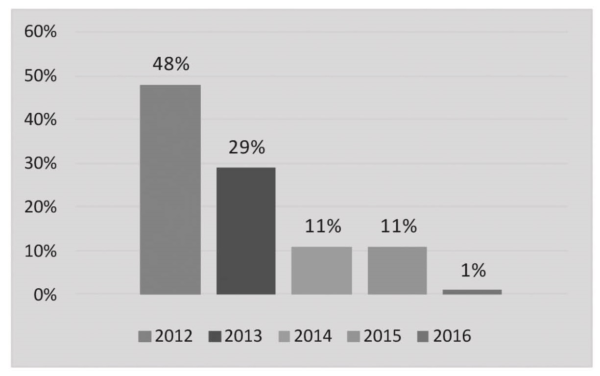 En el Gráfico 7 pueden observarse los años en los que se registran los mayores porcentajes de abandono en el grupo total de desertores de la cohorte analizada (N=80), desde el momento de ingreso a la universidad hasta el año de comienzo del relevamiento (2016). De acuerdo con lo estipulado en el plan de estudios es en este año cuando se supone que estos estudiantes deberían estar cursando el quinto año de la carrera.