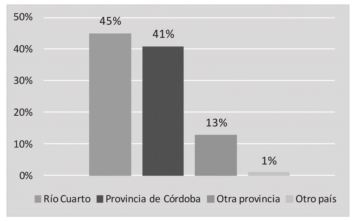 Tal como se observa, más de la mitad de los estudiantes que abandonaron sus estudios (55%) provenía de otros puntos del país e incluso de otros países. Esta es una variable importante si se tiene en cuenta que son estudiantes que en su mayoría han debido cambiar de ciudad, alejarse del seno familiar, aprender y acostumbrarse a usar medios de transporte distintos, compartir la vivienda con desconocidos o vivir solos, realizar tareas domésticas, etc. Estos obstáculos que atraviesan quienes comienzan los estudios en una ciudad diferente a la de origen los coloca en una situación de mayor vulnerabilidad respecto a quienes pueden estudiar permaneciendo en la ciudad en la que viven y cerca del hogar familiar. De hecho, en estudios previos con alumnos de esta misma cohorte pero cuyas trayectorias académicas se ajustaban al recorrido teórico o ideal, se encontró que un 60% eran oriundos de Río Cuarto (Moreno y Chiecher, 2018).