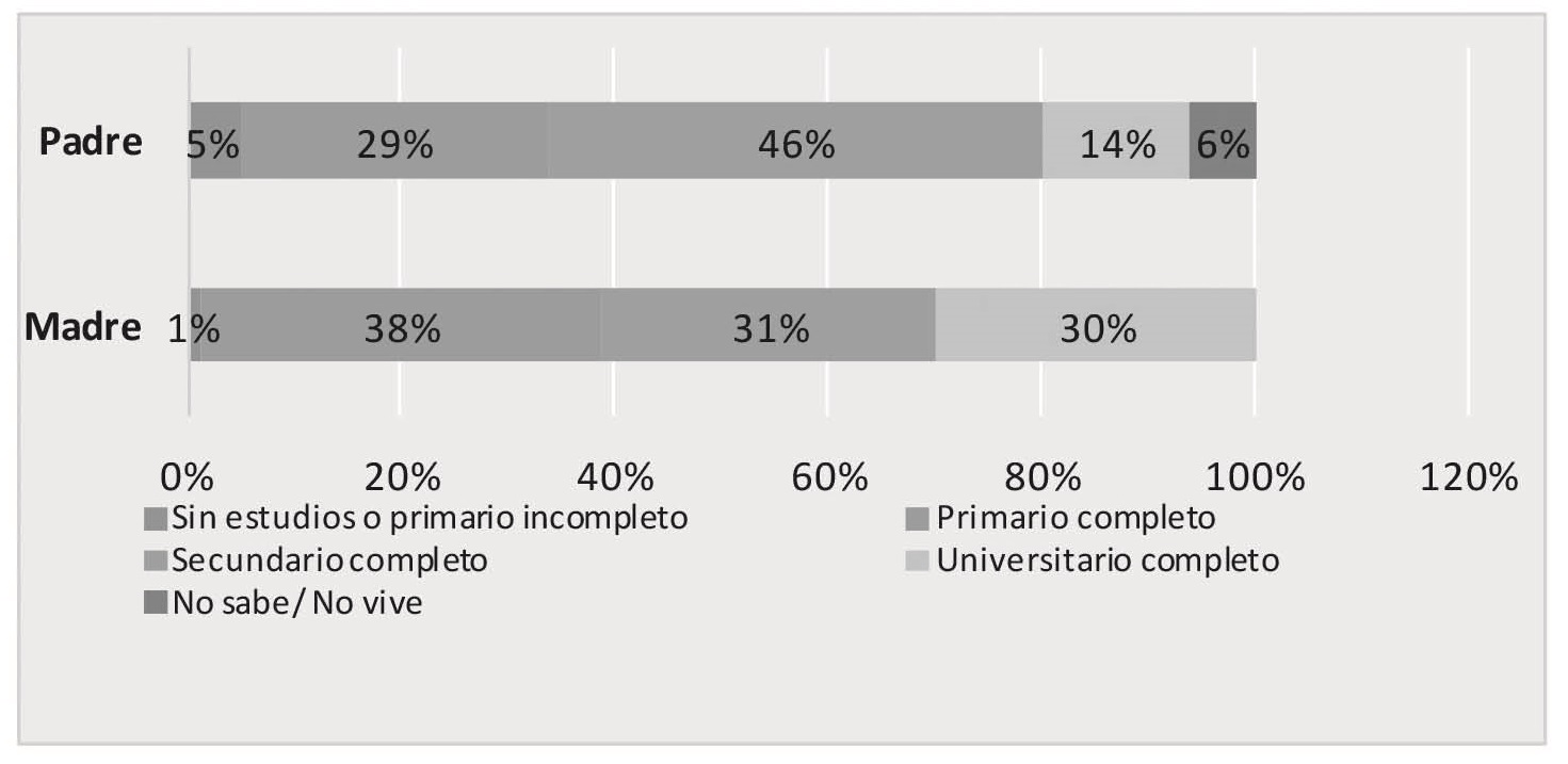 Se puede observar que el 80% de los padres no ha tenido acceso a estudios de nivel terciario o universitario. El 46% ha completado el nivel secundario y el 29% ha completado solo la educación primaria. Las madres tienen un mayor porcentaje en el nivel de instrucción terciaria y universitaria comparado con los padres. Sin embargo, solo un 38% completó la primaria y un 31% el nivel secundario.
