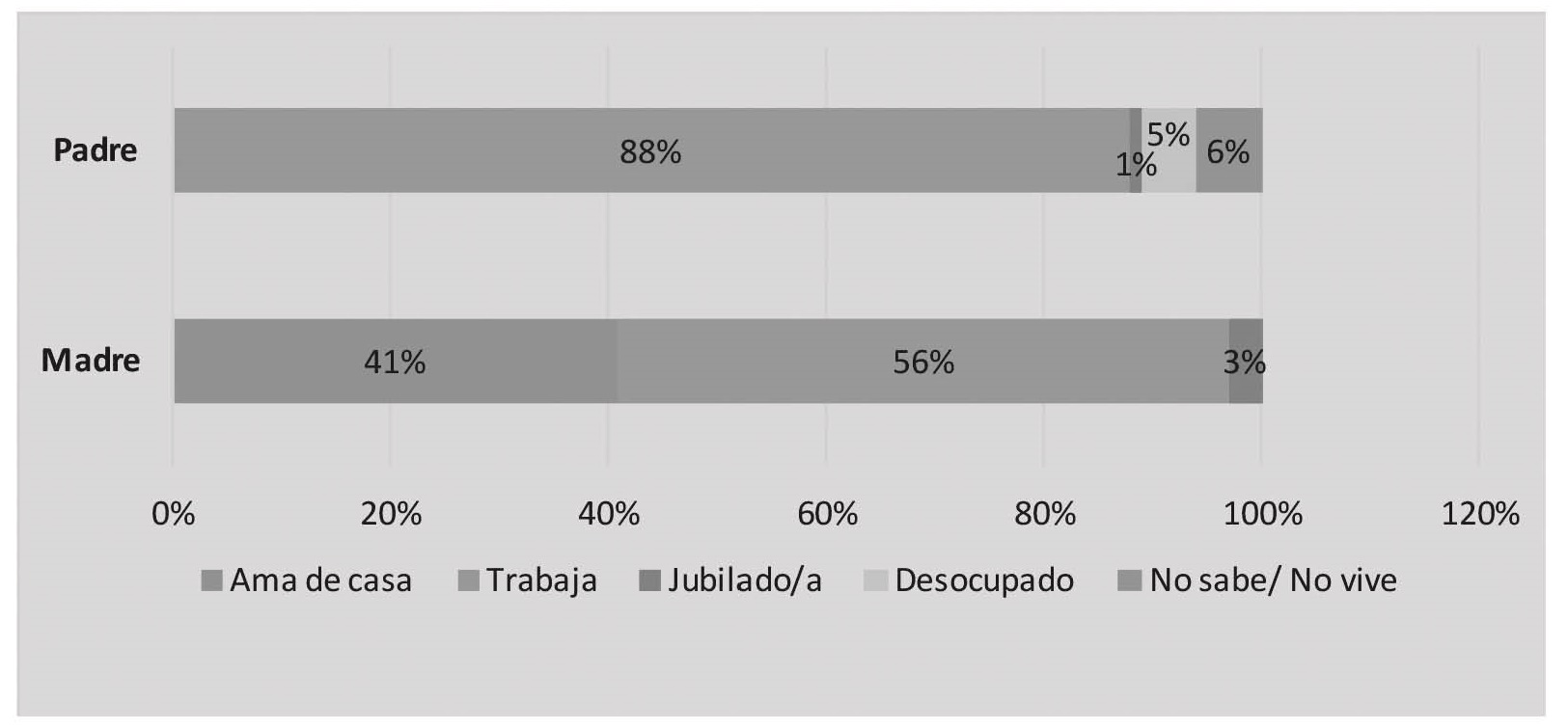 En cuanto a sus padres, la mayor parte no ha tenido experiencias en el nivel de educación superior, por lo que estos jóvenes eran la primera generación de estudiantes universitarios en sus familias. Altos porcentajes indican que ambos progenitores trabajaban en el momento en que estos estudiantes estaban en la universidad y fundamentalmente era el padre el sostén del hogar.