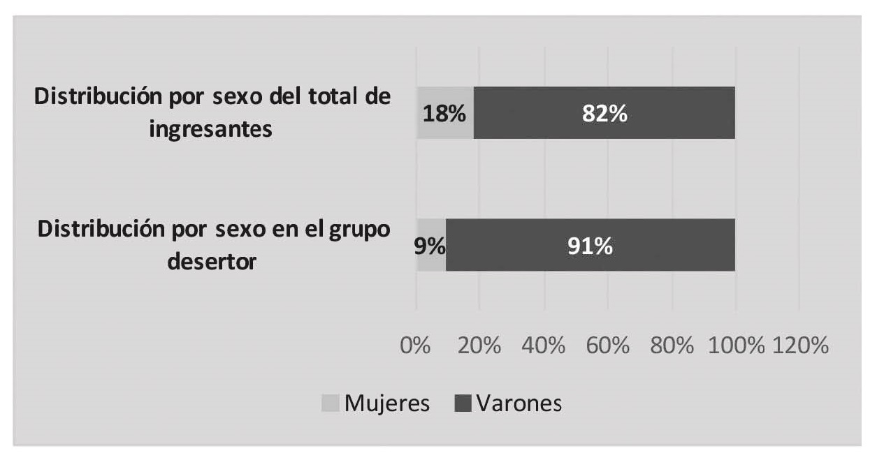 El Gráfico 1 presenta comparativamente la distribución según sexo en el grupo total de ingresantes (159) y en el grupo de desertores (80).