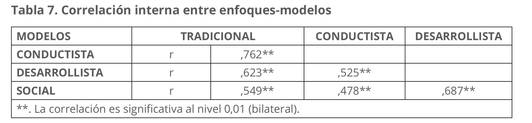 Por las similitudes y elementos comunes de los modelos el conductista y el tradicionalista presentan una fuerte correlación (r = 0,762) evidenciándose así una notable hibridación en la práctica pedagógica. De igual forma los modelos desarrollista y social se ajustan plenamente entre ellos con un r de 0,687. La correlación más baja se da entre los enfoques conductista y social pues sus prácticas, características y elementos son diametralmente opuestos.