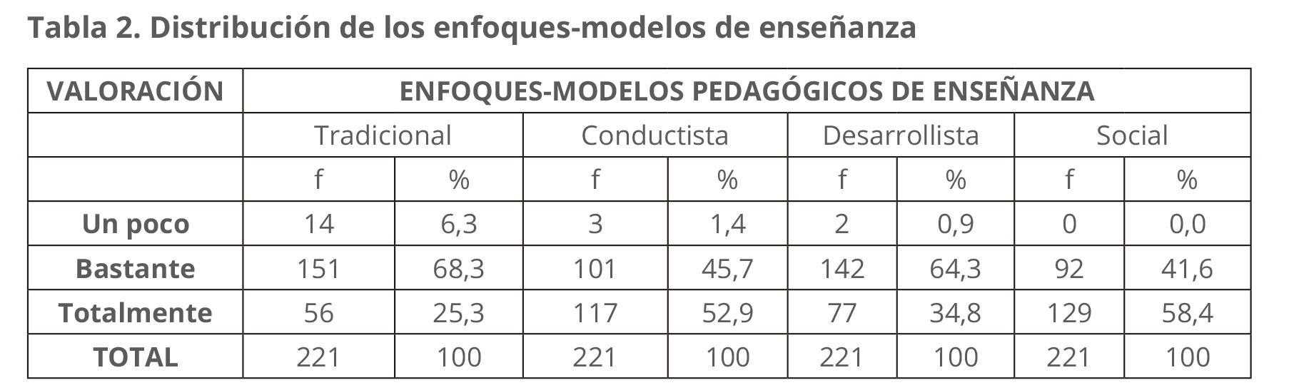 Tabla 2: Distribución de los enfoques-modelos de enseñanza