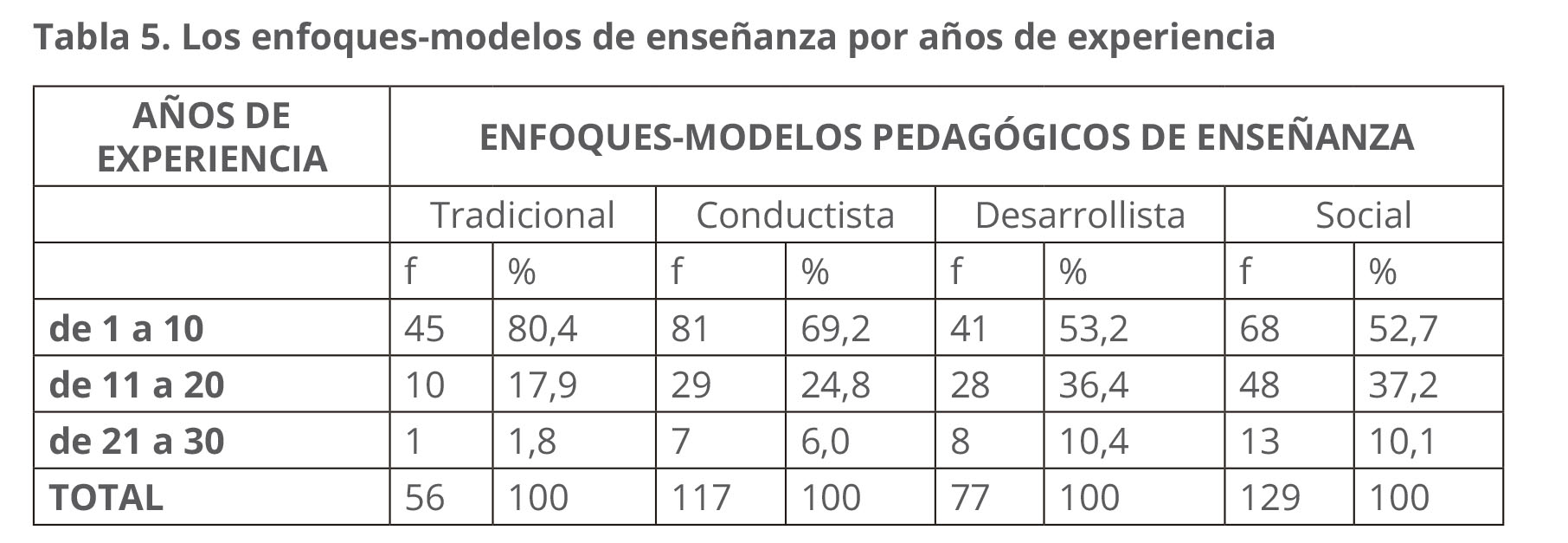 Tabla 5: Los enfoques-modelos de enseñanza por años de experiencia