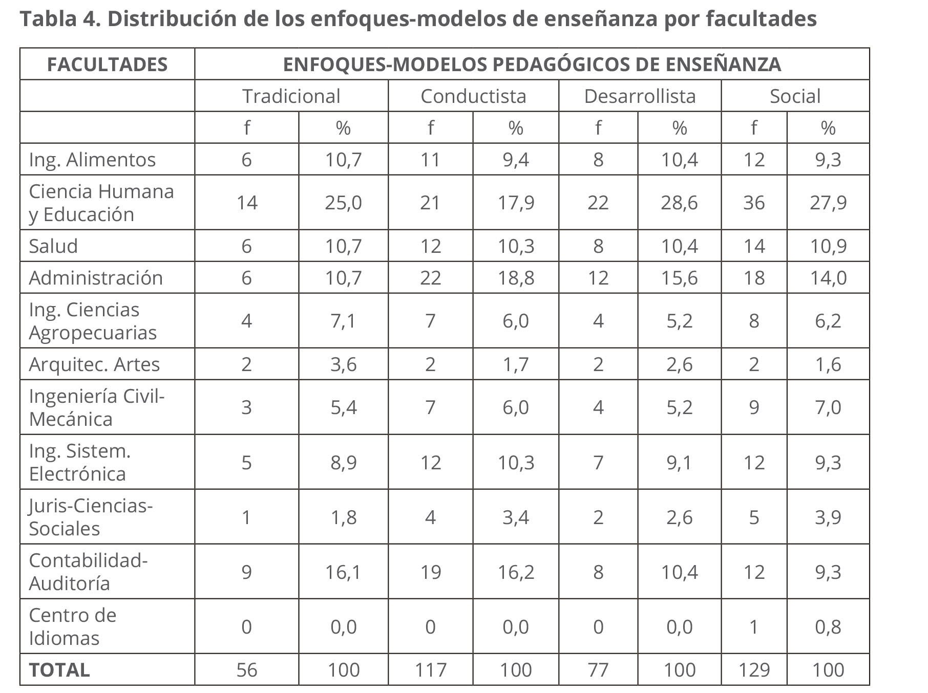 Con un análisis más detallado y profundo la Facultad de Ciencias Humanas y de la Educación lidera con la presencia de los 4 enfoques-modelos de enseñanza. El más evidente es el social con el 9,5%, seguido del desarrollista con el 5,8%, el conductista con el 5,5% y finalmente el tradicionalista con el 3,7%. Significa entonces que hay clara presencia de los cuatro estilos de enseñanza arraigados en los docentes con los que se forma y que se transmite a los dicentes o futuros maestros y formadores de generaciones venideras. Esta gama de prácticas pedagógicas es lo que se denomina hibridación pedagógica docente, donde se entrecruzan y amalgaman los diferentes estilos de enseñanza que le dan más riqueza y potencialidad al hecho educativo universitario.