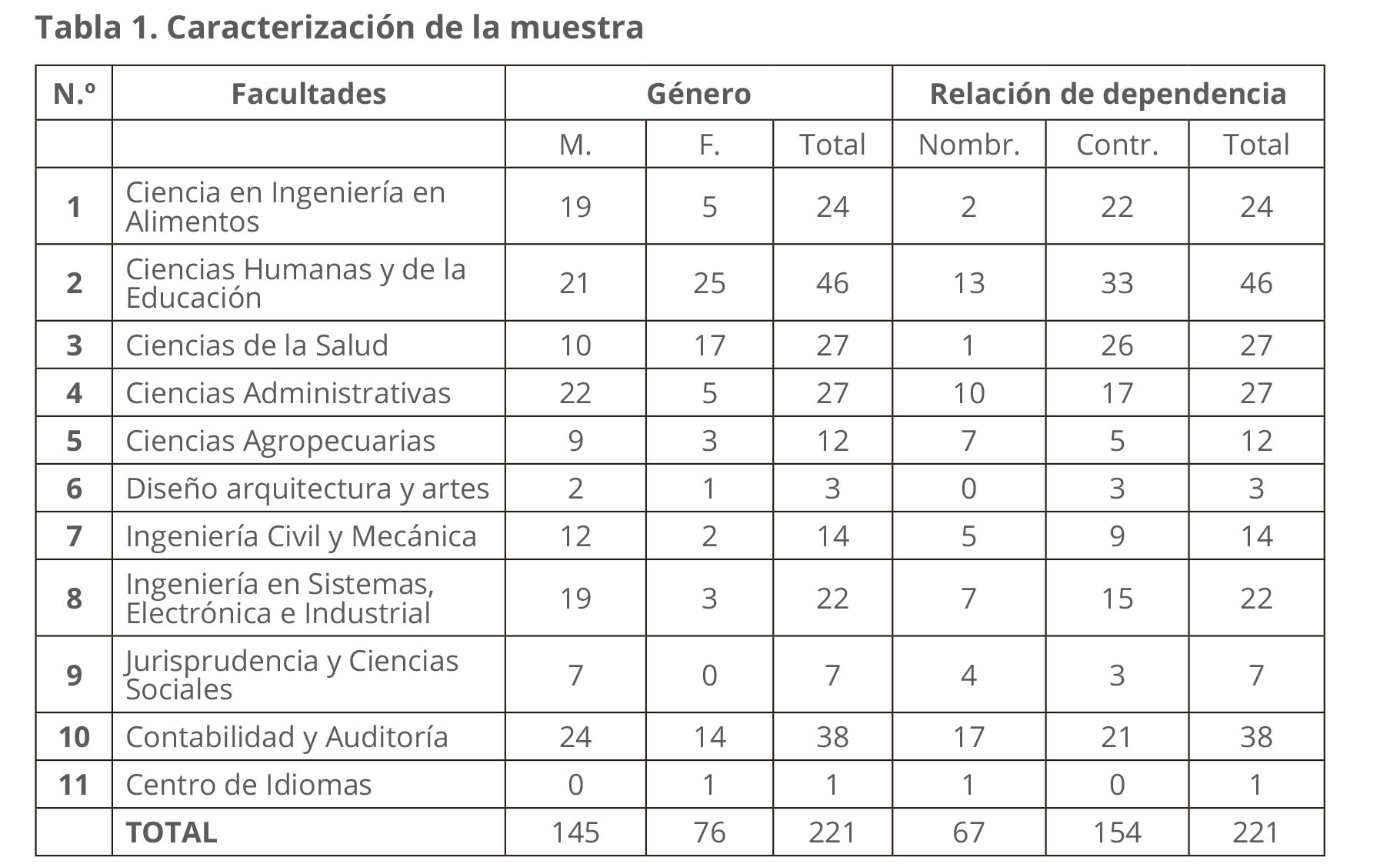 Una descripción rápida de la composición general del plantel docente en la UTA deja ver la realidad tanto en lo referente a género como a relación de dependencia, lo que es motivo de análisis sociológico y antropológico. La mayoría de las carreras técnicas tienen supremacía de docentes varones, excepto la facultad de Ciencias Humanas y de la Educación en la que se forman profesionales parvularios, psicólogos educativos, docentes de educación básica y cuya población estudiantil es mayormente femenina (Mantilla-Falcón, Galarza-Galarza and Zamora-Sánchez, 2017). Este sesgo se comprende fácilmente en base a la creencia de que “las acciones docentes y administrativas en la educación superior están siendo permeadas por constructos sociales dentro de los cuales cobran particular importancia aquellas que establecen diferencias de comportamiento asignado a hombres y a mujeres en los diversos escenarios de interacción humana, específicamente en la educación superior, llegando a clasificar por género hasta la oferta académica de las instituciones” (Restrepo-García, Franco-Muñoz and Quiroz-Posada, 2011).
