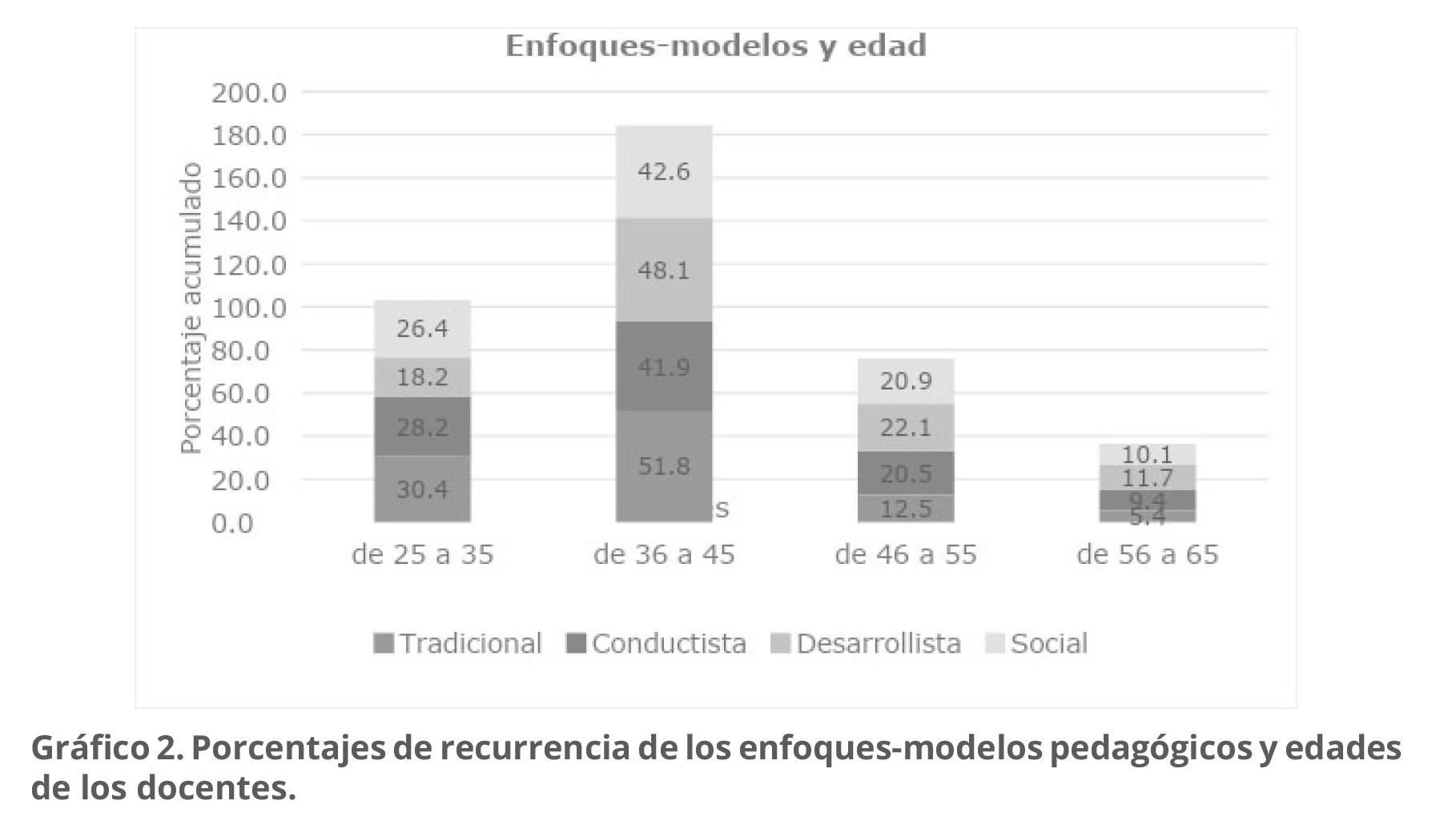Gráfico 2: Porcentajes de recurrencia de los enfoques-modelos pedagógicos y edades de los docentes.