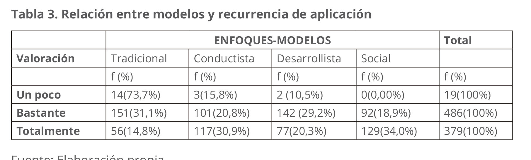 Como ningún docente tiene exclusividad absoluta en cuanto a un modelo determinado sino que, por el contrario, también evidencian características de los modelos complementarios, el estudio demuestra que el 31,07% es bastante tradicionalista, el 29,22% es desarrollista, el 20,78% es conductista y el 18,93% se considera social, quedando así demostrada la verdadera hibridación de modelos pedagógicos con una clara complementariedad u oposición en el orden de importancia y recurrencia.