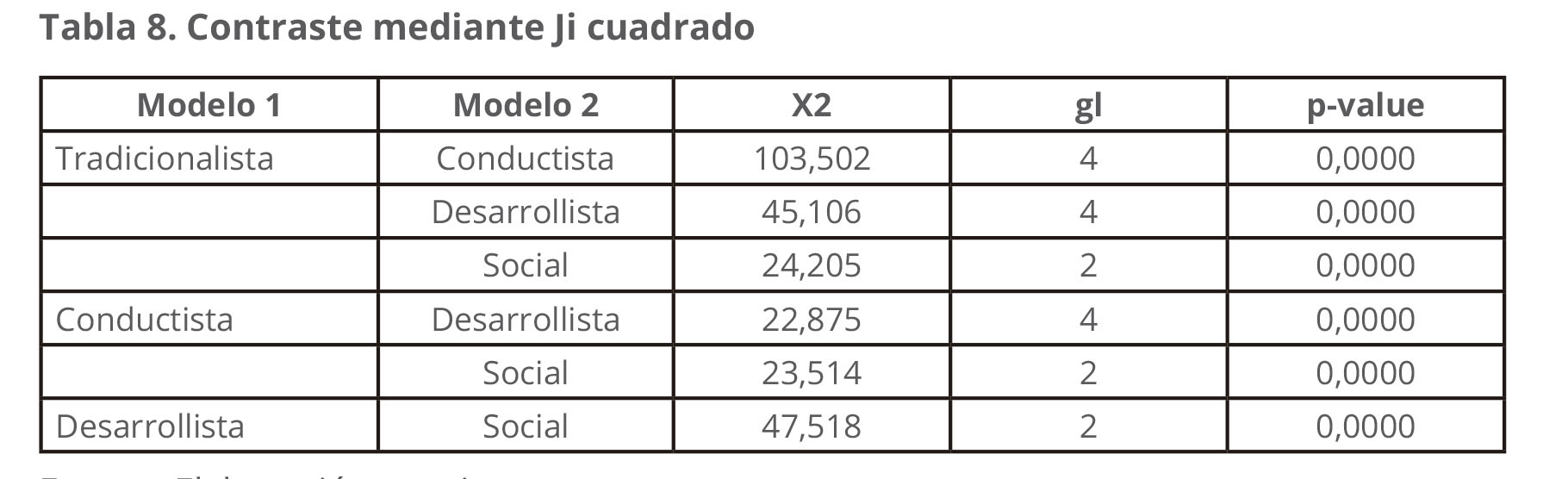 Establecida una asociación entre pares de modelos pedagógicos (tradicionalista vs. conductista) y la magnitud de ser totalmente, bastante y un poco de cada uno de los modelos, aplicado el estadígrafo del X2 (Ji cuadrado) los resultados son significativos en cuanto a las diferencias entre ellos y a la hibridación que representan. No hay prácticas pedagógicas exclusivas y puras sino la mezcla proporcional de ingredientes importantes de uno u otro modelo en la actividad educativa. Los resultados se evidencian en la siguiente Tabla 8: