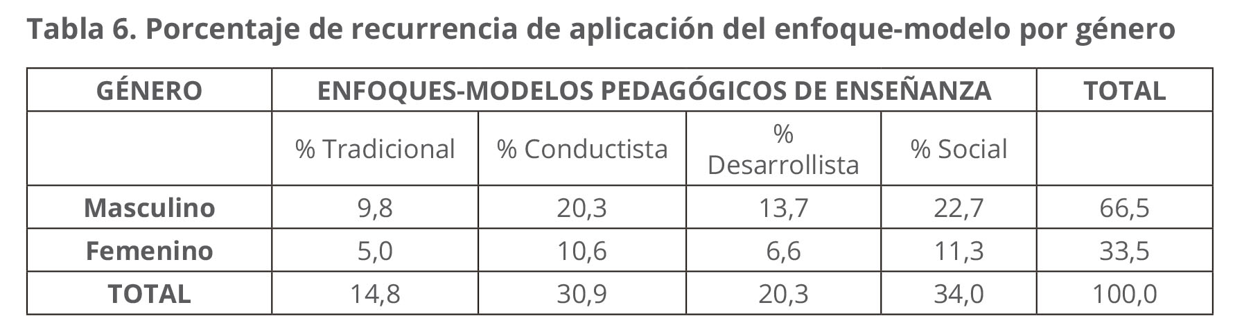 Las tendencias y puestas en práctica de los modelos pedagógicos no se diferencian entre hombres y mujeres, lo que significa que el género no es una categoría que incida en la aplicación de tal o cual modelo. Simplemente el docente lleva a cabo su actividad educativa en función de sus necesidades, saberes y hábitos pedagógicos.