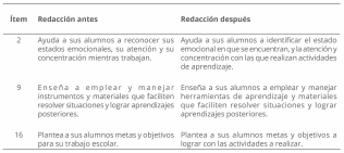 La mejora en la redacción de los ítems permite reconocer específicamente aquellos aspectos que deben ser considerados por el docente para favorecer un óptimo desarrollo metacognitivo en sus estudiantes.