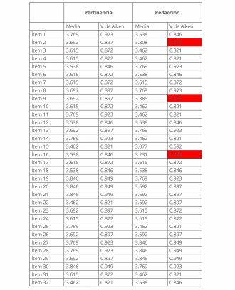 Los ítems que fueron señalados con valores menores fueron el 2, 9 y el 16. Se revisó y corrigió su redacción para que fueran más claros (Tabla 6).