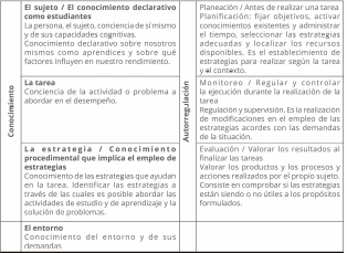 En este sentido resulta indispensable favorecer el desarrollo de competencias metacognitivas, las que hacen referencia a los conocimientos que el sujeto tiene sobre sus procesos cognitivos. Esto involucra capacidades direccionadas hacia la solución de problemas tales como planificación, autorregulación, autocontrol y autoevaluación. Estas competencias permiten reajustar las propias acciones mediante el empleo de diversas estrategias y prever y enfrentar las dificultades que se presenten. Inicialmente es el docente quien tiene el control de las mismas pero gradualmente el alumno irá mejorando su nivel de competencia y autonomía hasta lograr asumir el control (Alvarado-Moreno, Zárate-Ortiz & Lozano-Rodríguez, 2013). Toledo (2005), citado por Rodríguez-Vera (2019), define la competencia metacognitiva como la capacidad de una persona para cuestionarse sobre sus procesos cognitivos, para planificarlos, evaluarlos (antes, durante y después de una actividad) y ajustar sus acciones cuando sea necesario. García (2010), citado por Rodríguez-Vera (2019) coincide en definirla como el conjunto de actitudes, conocimientos y habilidades que junto con sus valores permiten al individuo planificar, monitorear y evaluar su propio proceso de aprendizaje y lograr así desenvolverse con éxito y de manera autónoma en las diversas actividades, tareas o contextos que se le presentan.