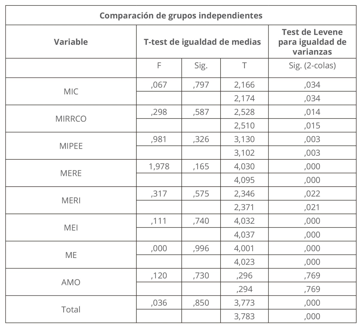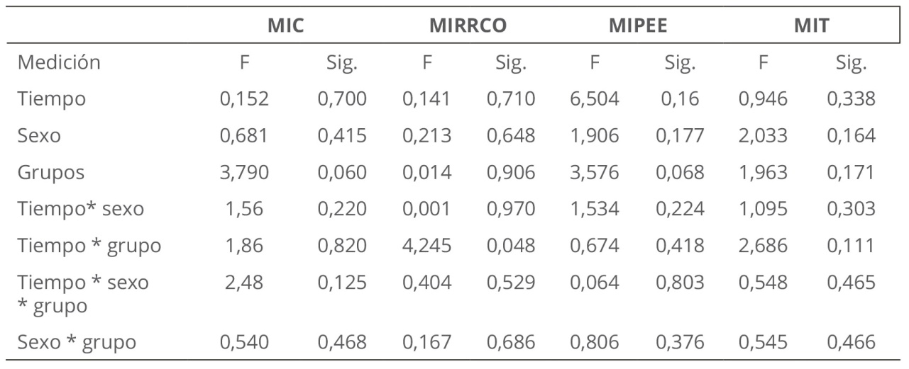 En la Tabla 5 puede observarse que hay diferencias en la variable MEI por grupo (F: 5,50; p =,025), así como en la interacción tiempo (mediciones) * grupo (F: 5,25; p = 0,29). Esto es, en cuanto a la variable grupo, el grupo de estudio desde el inicio tuvo puntajes mayores de MEI que el grupo control y así sucedió en la segunda medición. Empero, tal como puede observarse, esto no es un efecto de la implementación de la metodología ya que no hubo diferencias en las variables y en la interacción. Lo mismo ocurrió en la variable MET por grupo (F: 3,27; p = 0,08). Asimismo se observan interacciones significativas en la variable MERE (tiempo * sexo, F: 5,194; p = 0.029) y tiempo * grupo (F: 5,75; p = 0,022). No obstante, al no haber diferencias en las variables principales, las interacciones significativas no son representativas de algún hallazgo importante.