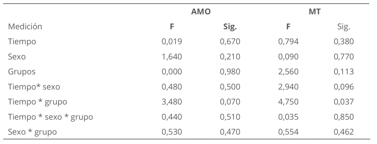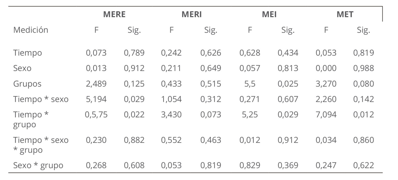 En la Tabla 5 puede observarse que hay diferencias en la variable MEI por grupo (F: 5,50; p =,025), así como en la interacción tiempo (mediciones) * grupo (F: 5,25; p = 0,29). Esto es, en cuanto a la variable grupo, el grupo de estudio desde el inicio tuvo puntajes mayores de MEI que el grupo control y así sucedió en la segunda medición. Empero, tal como puede observarse, esto no es un efecto de la implementación de la metodología ya que no hubo diferencias en las variables y en la interacción. Lo mismo ocurrió en la variable MET por grupo (F: 3,27; p = 0,08). Asimismo se observan interacciones significativas en la variable MERE (tiempo * sexo, F: 5,194; p = 0.029) y tiempo * grupo (F: 5,75; p = 0,022). No obstante, al no haber diferencias en las variables principales, las interacciones significativas no son representativas de algún hallazgo importante.
