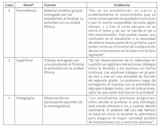 En la Tabla 3, en relación al caso 5, se ha categorizado el nivel de prerreflexión dado que los estudiantes sostienen una visión lineal y simple de los procesos de enseñanza. En el caso 2, corresponde a un nivel superficial debido a que la estudiante realiza una descripción basada en las estrategias didácticas utilizadas por el docente filmado para alcanzar sus objetivos de enseñanza. En el caso 1, se le adjudica el nivel pedagógico dado que los estudiantes establecen relaciones con conocimientos didácticos teóricos y han reflexionado en torno a la importancia de las decisiones del docente sobre los resultados de aprendizaje de sus alumnos.
