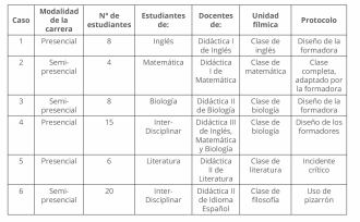 Para minimizar la posibilidad de implicancia ninguno de los casos se desarrolló con grupos de estudiantes entre cuyos docentes se encontraran las investigadoras del presente trabajo. Ninguno de los docentes de didáctica estaba sujeto a relaciones jerárquicas con las investigadoras.
