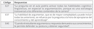 Los casos presentados (Tabla 3) plasman una relación estrecha entre la utilización de la pregunta y la necesidad de que los estudiantes desarrollen la capacidad de defender sus ideas y puntos de vista. Asimismo se hace mención a la complejidad de unas habilidades en comparación con otras. Esta noción se complementa con la existencia de una transversalidad en el uso de la pregunta, que permite activar diferentes habilidades y, al mismo tiempo, responder a los distintos requerimientos propios de una actividad curricular.