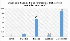 En segundo lugar, una de las habilidades que más busca reforzar el profesorado en sus estudiantes es la argumentación, independientemente del nivel de escolarización o de la carrera universitaria. Según el estudio la pregunta favorece la capacidad de argumentar y la habilidad de explicar, habilidad básica y fundamental para el estudiantado de pedagogía en sus prácticas cotidianas.