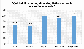 La Figura 1 evidencia la percepción que poseen los informantes acerca de todas las habilidades lingüístico-cognitivas que la pregunta, como estrategia, activa en el aula. De acuerdo con los resultados, el 100% de los participantes considera que tanto la habilidad de argumentar como la de explicar están íntimamente relacionadas con el uso de la pregunta durante el trabajo académico. Por su parte, las otras habilidades también se accionan dependiendo de la finalidad con la que se aborde la pregunta en clase.