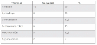 Según la Tabla 4, 12 estudiantes de pedagogía (30%) sostienen que la pregunta se asocia a la reflexión en el aula. Por su parte, el 20% la asocia al aprendizaje y el 17,5% al conocimiento. Otras palabras mencionadas (en segundo y tercer lugar) son: asimilación, ayuda, coevaluación, cognición, comprensión, comunicación, contexto, diálogo, duda, ejemplificación, estimulación, evaluación, evidencia, interacción, interpretación, juicio, monitoreo, objetividad, observación, opinión, percepción, proceso, resolución, retroalimentación, transformación y verificación. Dentro de los términos mencionados en segundo y tercer lugar los citados con mayor frecuencia fueron monitoreo y retroalimentación, los que habitualmente se relacionan con la evaluación y cierre de una clase.