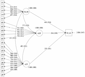Como último paso, con los ítems que sortearon exitosamente el Análisis Factorial y con base en los adecuados niveles de ajuste se procede a estimar mediante Ecuaciones Estructurales el modelamiento teórico propuesto. Esta es una técnica multivariante, cuya utilización en la investigación educacional se ha incrementado en el último tiempo en el interés de poner a prueba modelos teóricos que de manera más intuitiva permitan identificar los factores latentes e interacciones que definen los contextos educativos, las prácticas docentes y de aprendizaje (Khine, 2013; Kapucu y Bahçivan, 2015; Nagengast y Trautwein, 2016; Rigo y Donolo, 2018). En lo específico en este artículo se crea, en una sintaxis pertinente y parsimoniosa en Mplus v.07, un modelo de ecuaciones estructurales que busca determinar cómo las variables latentes que expresan las dimensiones Calidad educativa (Cal_ed), Apoyo Docente Percibido (ADP) y Apoyo Familiar Percibido (AFP) inciden sobre la Satisfacción Escolar (Sat_Esc) percibida.