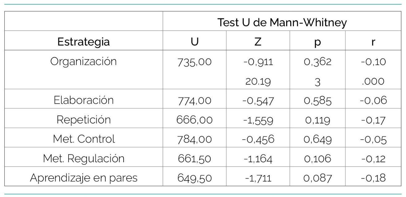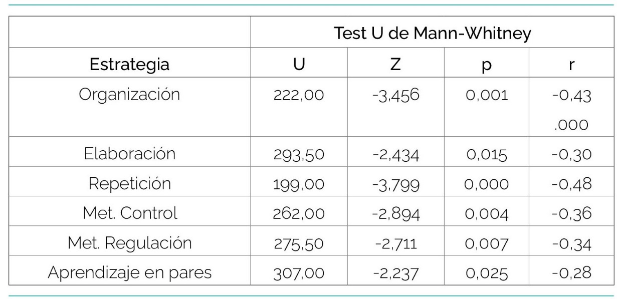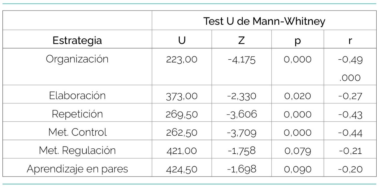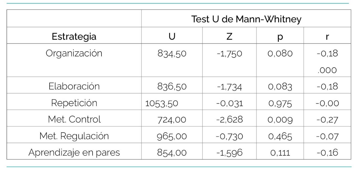 En lo que respecta a las diferencias en función del curso o semestre académico se hallaron algunas estadísticamente significativas en las EA de organización, elaboración, repetición, metacognitiva de control, metacognitiva de regulación y aprendizaje en pares.