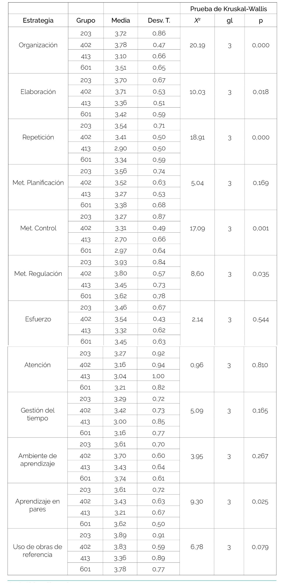 La evidencia de que existe un mayor uso de estrategias de aprendizaje a medida que el curso escolar aumenta (Gasco-Txabarri, 2016) se observa en este estudio principalmente al analizar los datos de los grupos de cuarto y sexto semestre, es decir, los grupos 413 y 601, respectivamente.