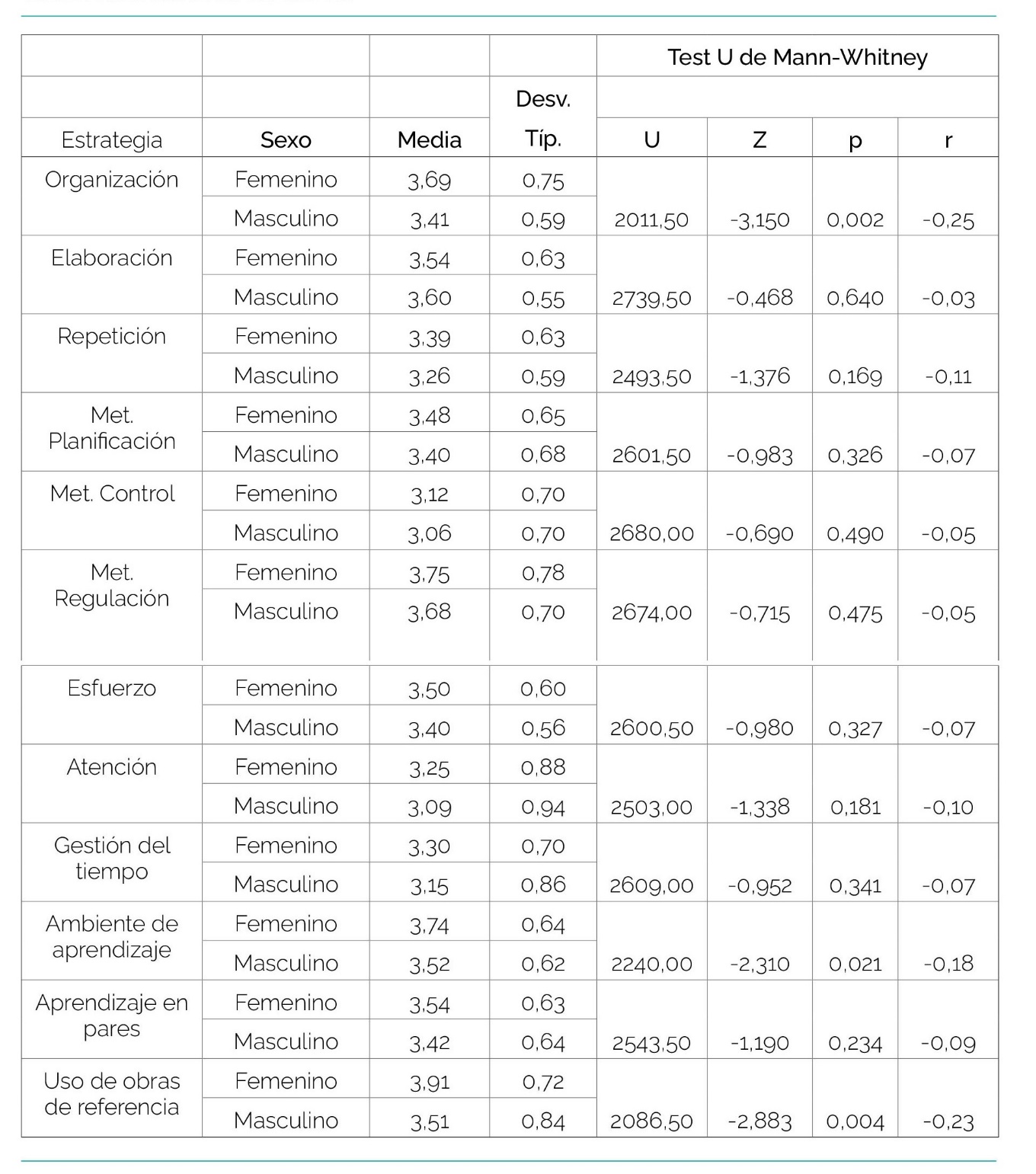 La EA de organización, referente a la manera de gestionar el aprendizaje, se presentó en este trabajo más en mujeres estudiantes, de igual manera que en el estudio de Gasco-Txabarri (2017b) en la escuela secundaria; es decir, hay evidencia de que esta estrategia es usada por las mujeres en diferentes niveles educativos. Por otro lado, en la etapa universitaria las mujeres solicitan más ayuda que los varones cuando tienen una dificultad en matemáticas (Virtanen y Nevgi, 2010).