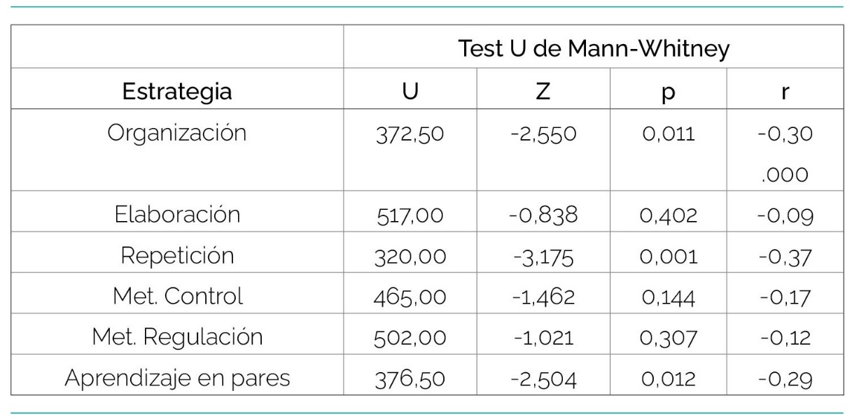 llevó a cabo un análisis con la prueba U de Mann-Whitney, en la